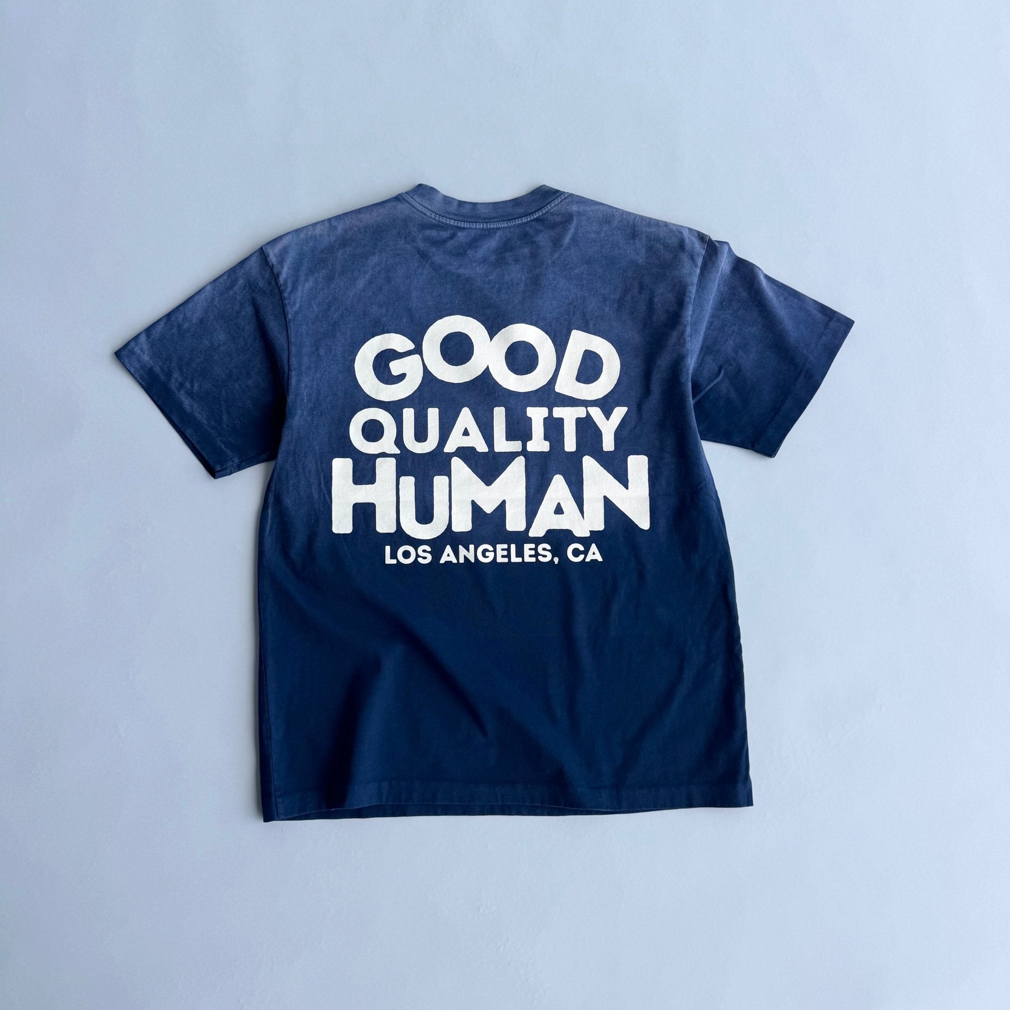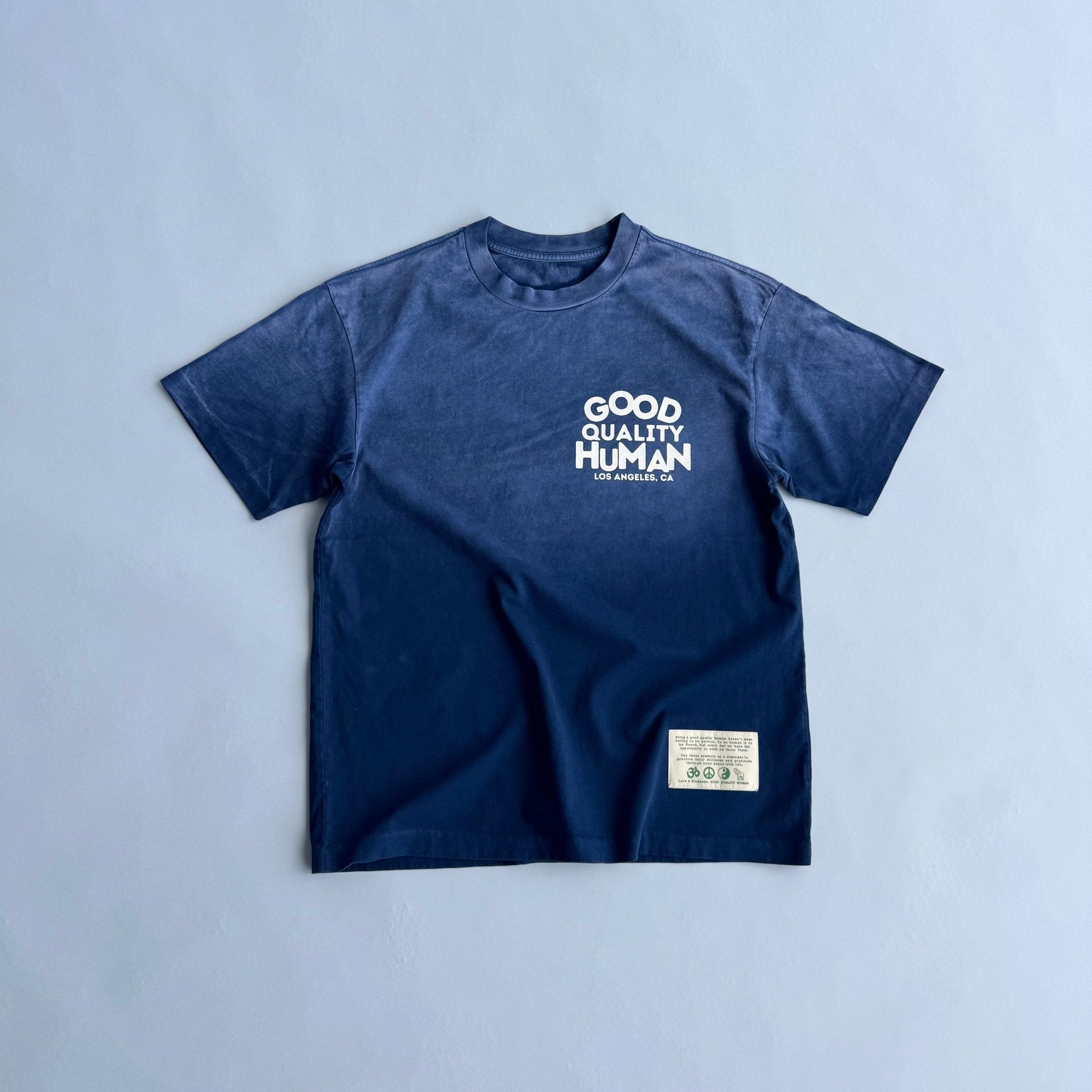 Featuring our signature Good Quality Human logo on the chest and a bold oversized print on the back, this piece represents kindness, community, and conscious living—rooted in Los Angeles, CA. The vintage navy wash gives each shirt a unique character, making no two exactly alike.